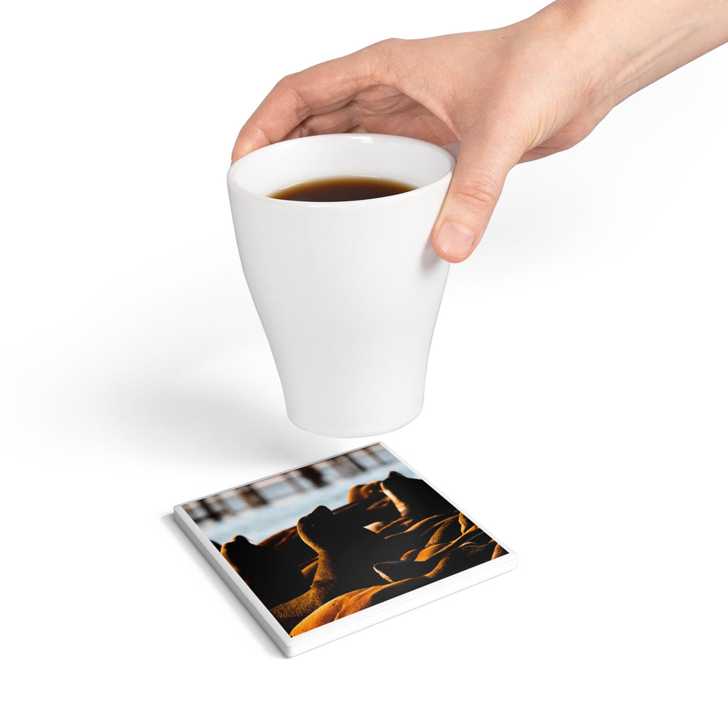 Elevate your home decor with this exquisite ceramic coaster. It features a photograph taken during golden hour illuminating the group of sea lions faces with a glowing touch. Perfect for adding a touch of elegance to your coffee table, these coasters exude a serene vibe reminiscent of nature's beauty. Crafted from premium white ceramic, they are not only durable but also ideal for both hot and cold beverages. The chic design fits seamlessly into your living space, offering protection against unsightly rings while enhancing your home’s aesthetic. Excellent for coffee lovers, tea enthusiasts, or anyone who enjoys hosting friends. These coasters make thoughtful gifts for housewarmings, holidays, or simply as a treat for yourself. They’re perfect for any occasion, from casual get-togethers to festive celebrations, adding a sophisticated touch to your entertaining.